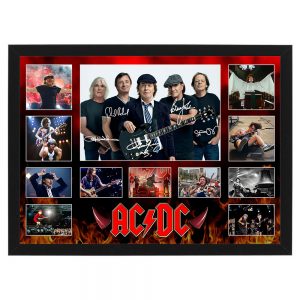 Music – ACDC Hand Signed & Framed Full Size Electric Guitar with Graphic Backdrop