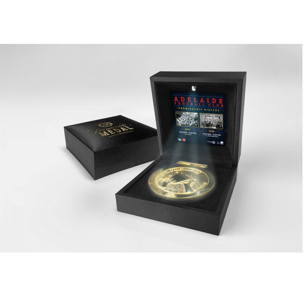• Features a replica AFL Premiers Medal superbly presented in a collectors box, with detailed insert listing each Adelaide Premiership, including their opponents and the relevant historical scorelines