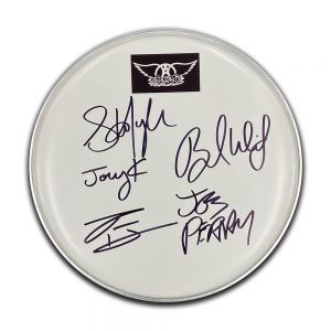- 32cm Drumskin hand signed by members of Aerosmith: Steven Tyler, Tom Hamilton, Joe Perry, Brad Whitford & Joey Kramer