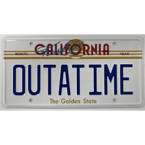 - Replica “OUTATIME” License Plate hand signed by Michael J Fox