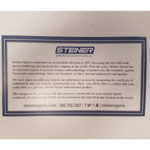 - Accompanied by an individually numbered Certificate of Authenticity with matching tamper-evident holograms as well as a 3rd party Steiner & Game Day Legends Certificate of Authenticity