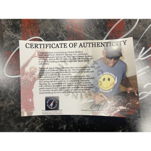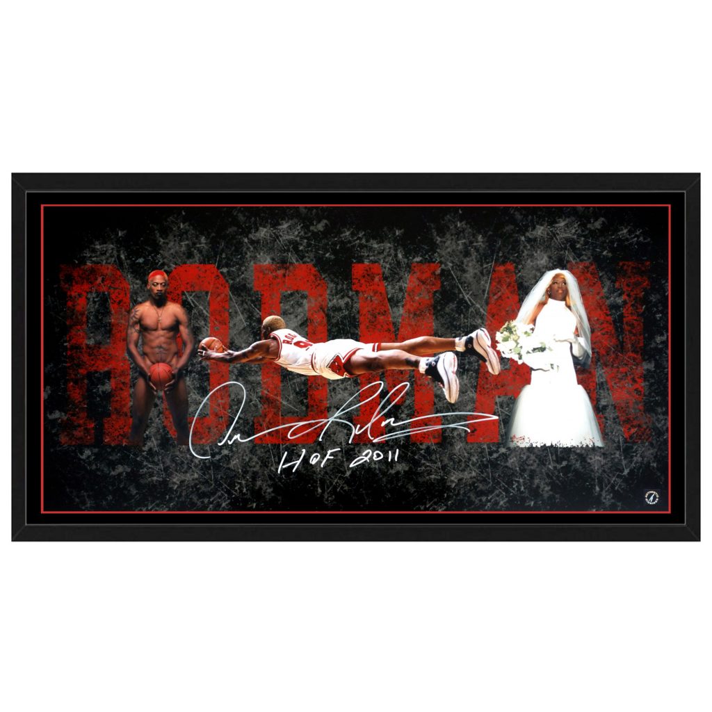 - High quality 15″ x 30″ Photograph, hand signed & inscribed “HOF 2011” by Dennis Rodman, mounted into a deluxe display