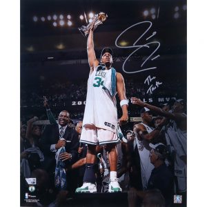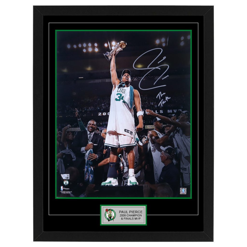 • High quality 16″ x 20″ photograph of Pierce lifting the 2008 Finals MVP Trophy hand signed by Paul Pierce (Boston Celtics), mounted into a deluxe display