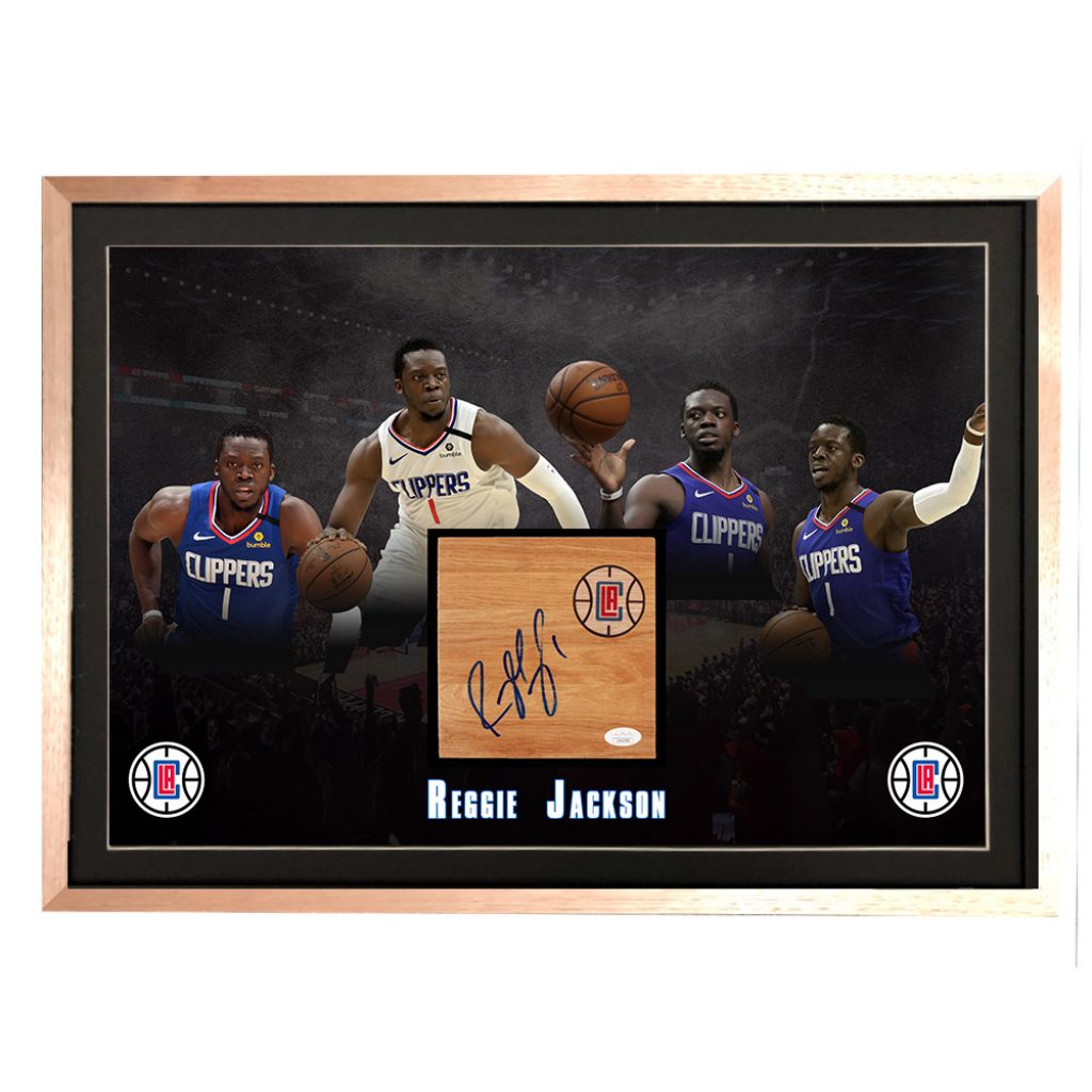 Basketball – Reggie Jackson Hand Signed & Framed 6×6 Floorboard Piece Display (JSA COA)