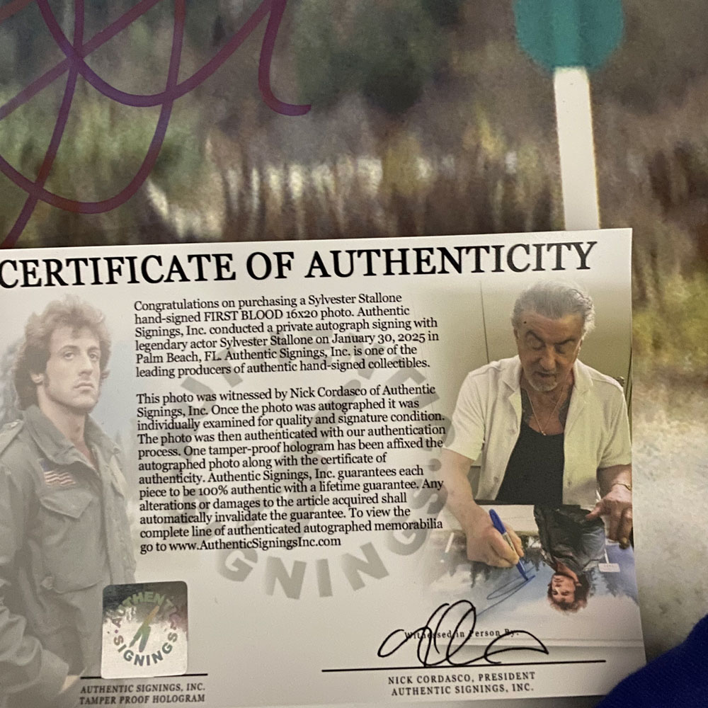 - High quality 16″ x 20″ photograph, personally signed by Sylvester Stallone, mounted into a deluxe display