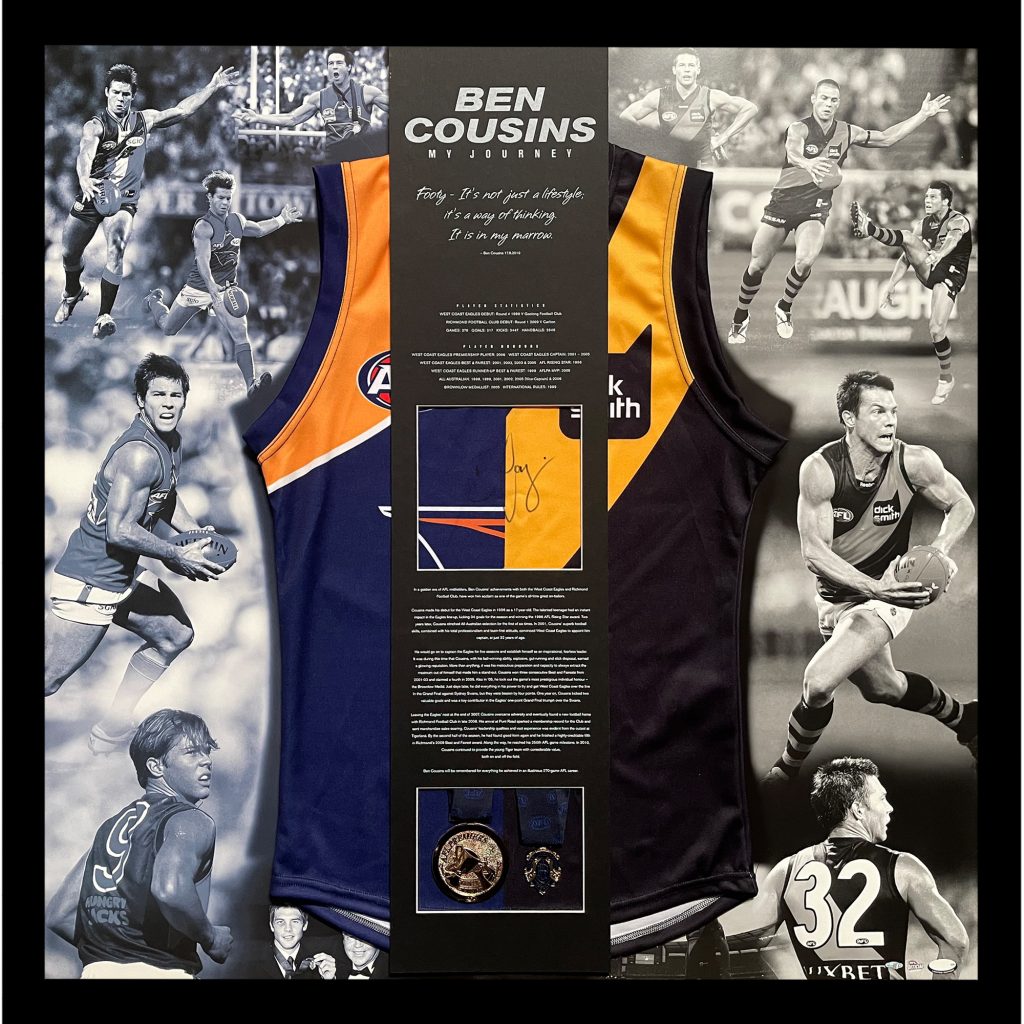 The Richmond Football Club, in conjunction with Ben Cousins, has produced a limited edition memorabilia piece to celebrate the career of Ben Cousins. This beautifully presented piece comes with a unique, once in a lifetime half/half Richmond and West Coast guernsey that is never to be reproduced!