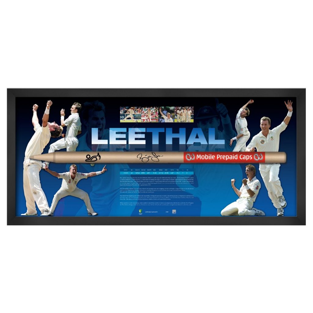 Brett Lee is the fourth Australian to claim 300 Test wickets. He joins the illustrious company of Lillee, McGrath and Warne as the only Australian bowlers to have reached this Extraordinary milestone. Taking his 300th Test wicket has elevated him into the upper echelons of Australian Test greats. The beauty about LEETHAL throughout his career has been his ability to take wickets at a rapid rate. His strike-rate speaks for its self – a wicket every 52.5 balls is better than the great West Indian Curtly Ambrose (54.5), Pakistani champion Wasim Akram (54.6) and only marginally inferior to Lillee (52). To celebrate this amazing achievement, Cricket Australia are proud to present to you ‘’LEETHAL”. This beautifully presented Framed Lithograph captures all the colour and excitement of Brett Lee throughout his career and also features an actual replica 3 Mobile stump from the 2008/09 series that Brett has signed.
