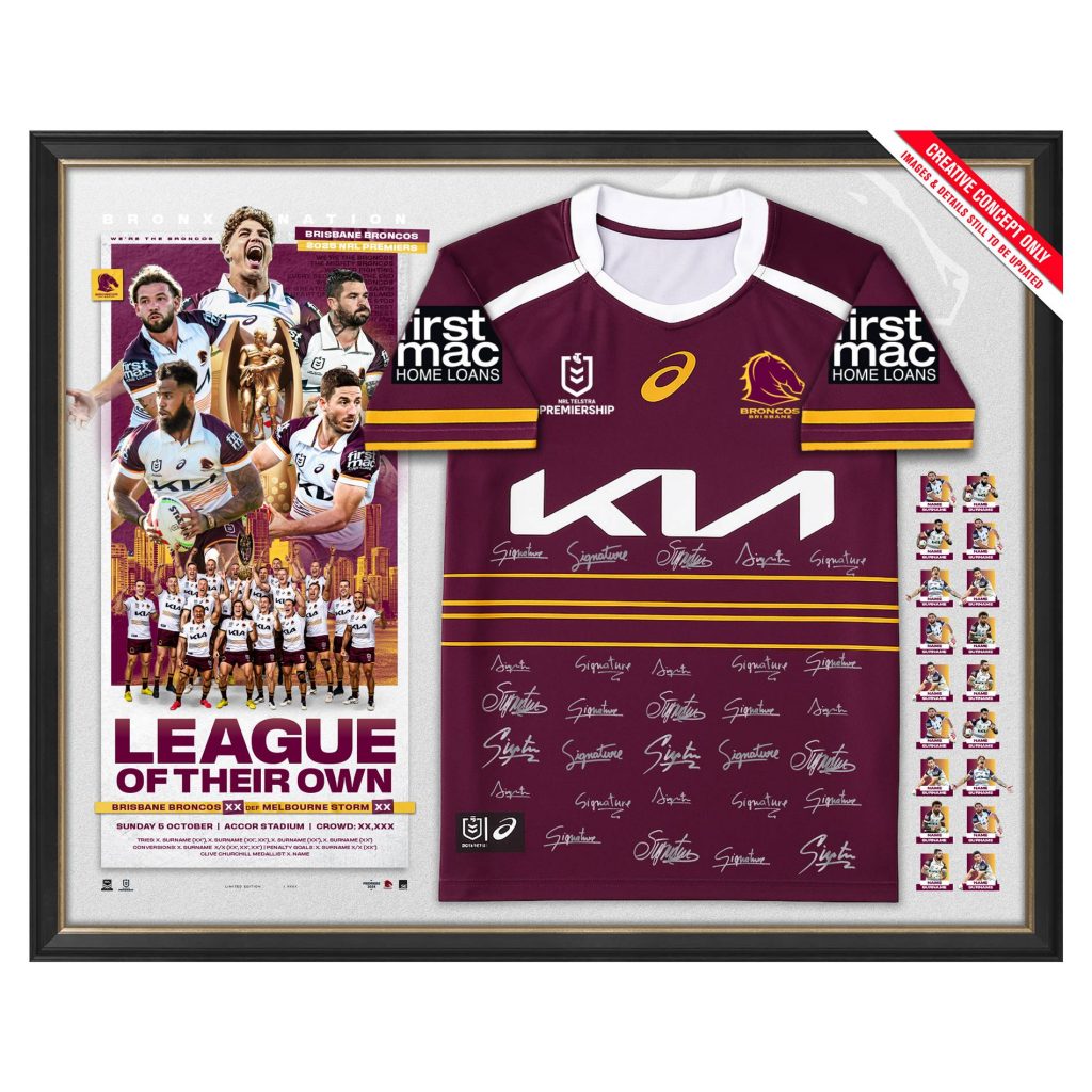 • Features an official Brisbane Broncos 2025 jersey, personally signed by the 2025 Premiership team