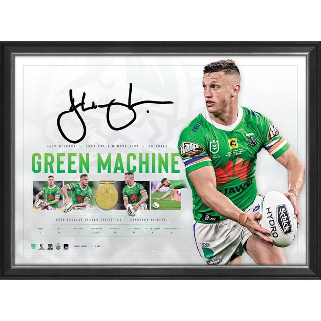 Canberra Raiders – Jack Wighton Signed Framed ‘Green Machine’ 2020 Dally M Medallist Limited Edition Print