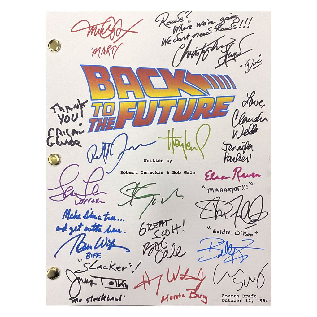 Back To The Future movie script cover featuring cast facsimile signatures