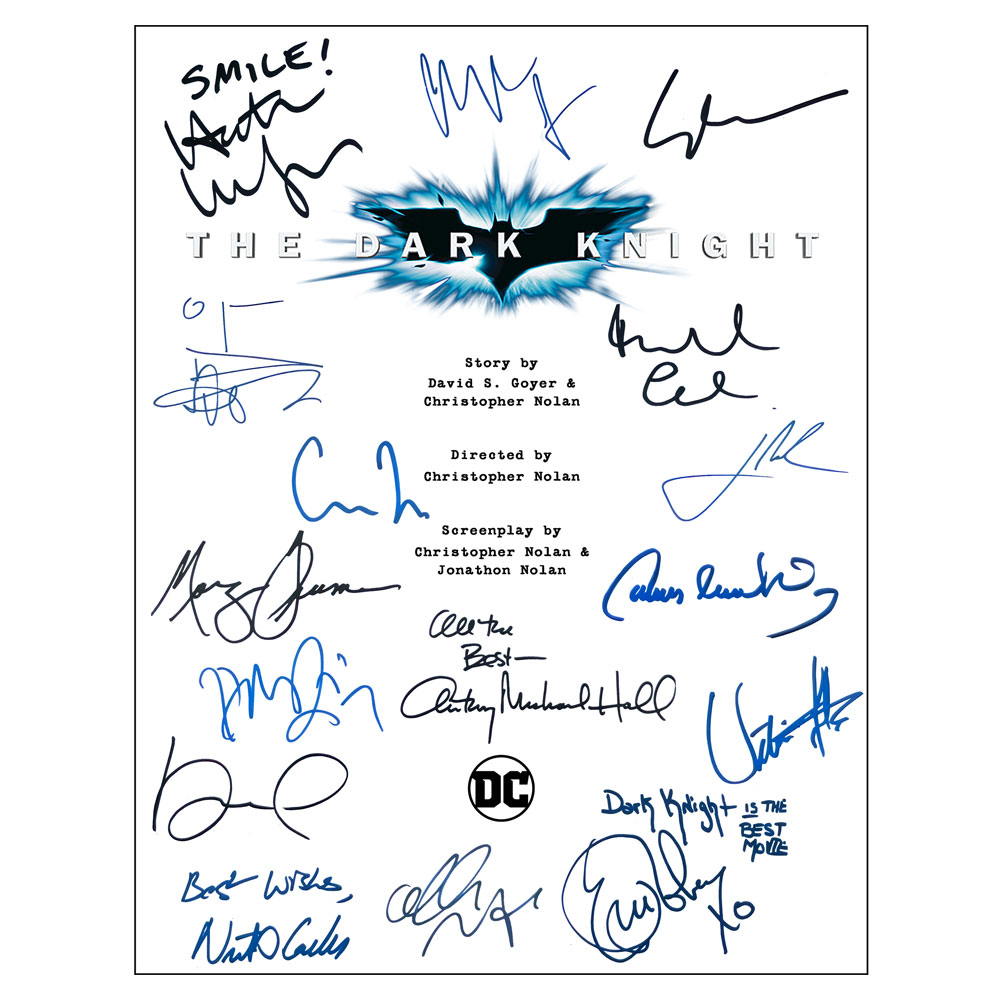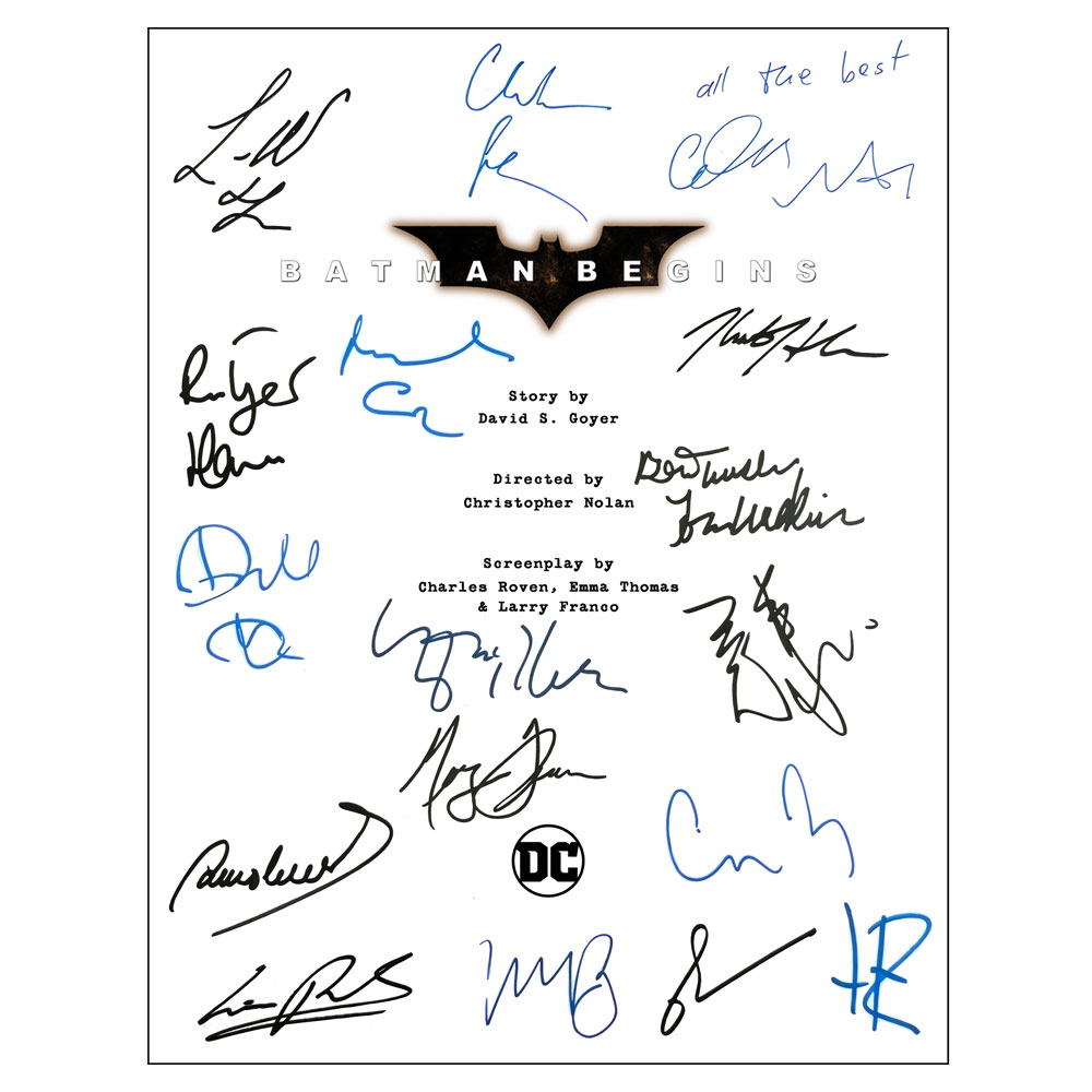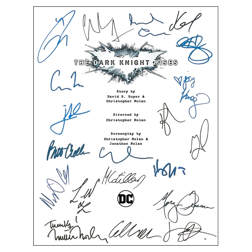 • Batman Begins, Batman The Dark Knight & Batman The Dark Knight Rises, movie script covers featuring cast facsimile signatures including: Christian Bale, Michael Caine, Liam Neeson, Katie Holmes, Gary Oldman, Cillian Murphy, Tom Wilkinson, Morgan Freeman, Heath Leger, Aaron Eckhart, Tom Hardy & More