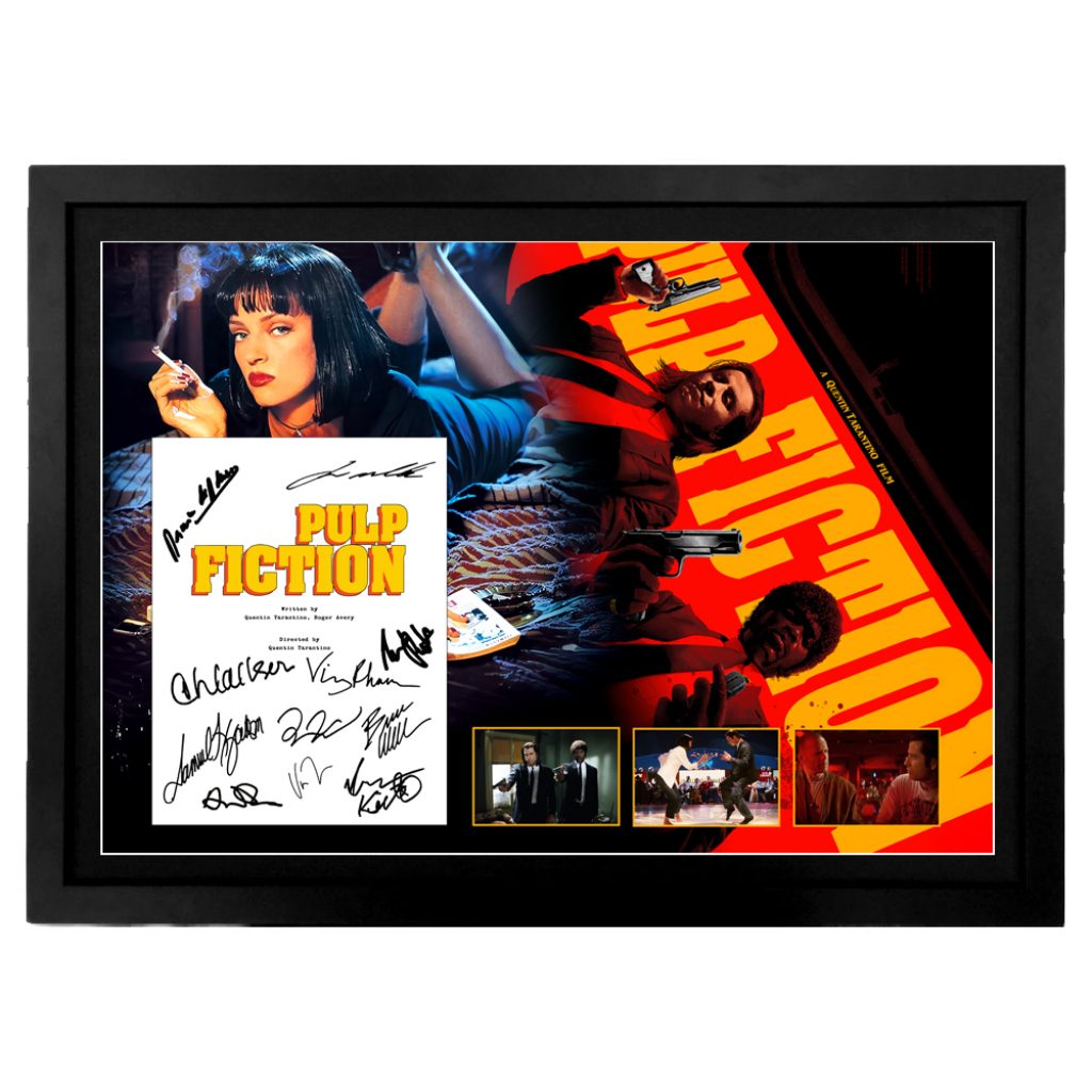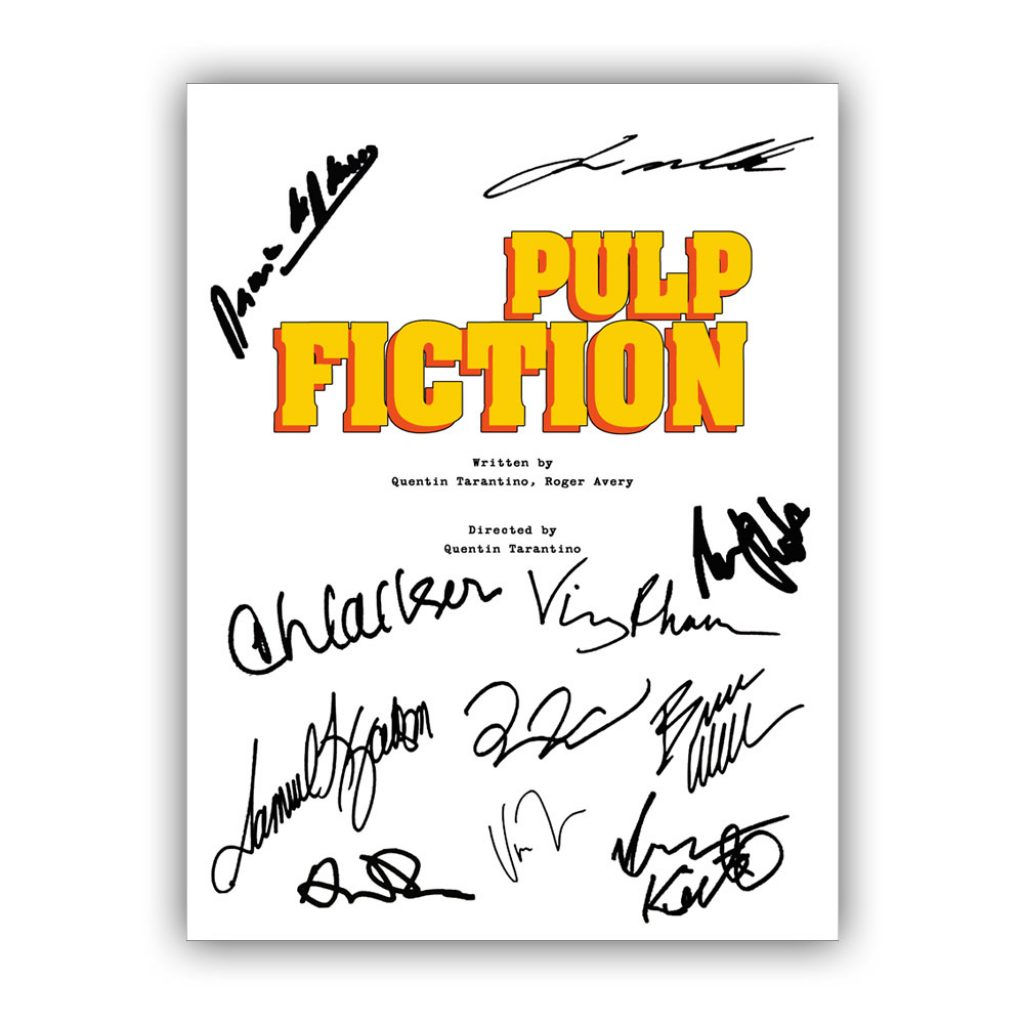 • Pulp Fiction movie script cover featuring cast facsimile signatures (Quentin Tarantino, John Travolta, Samuel L Jackson, Uma Thurman, Bruce Willis, Tim Roth, Christopher Walken & More)