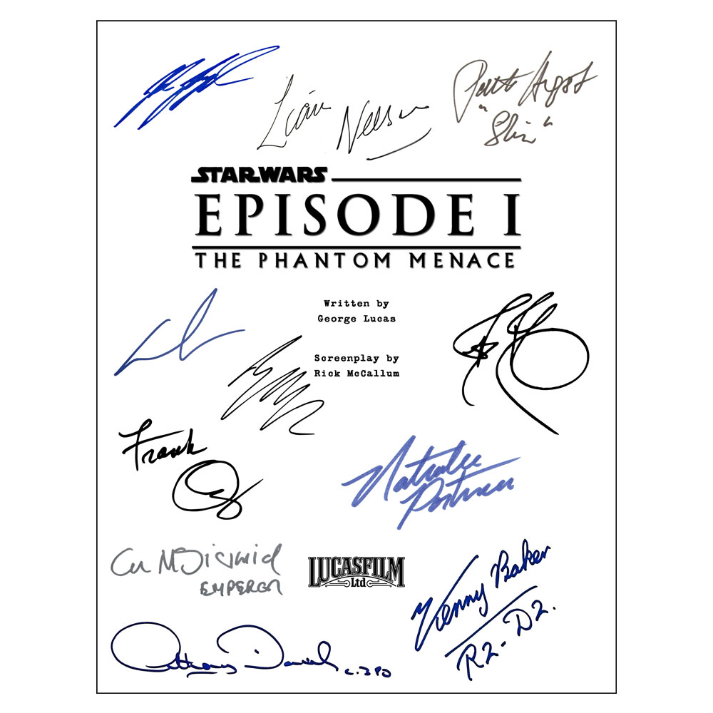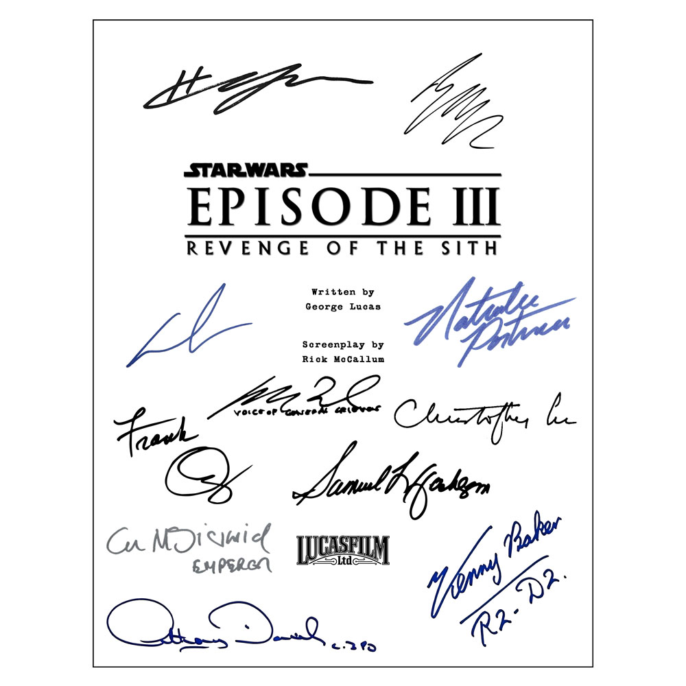 • Star Wars: A New Hope, Empire Strikes Back & Return of the Jedi movie script covers featuring cast facsimile signatures including: George Lucas, Ewan McGregor, Liam Neeson, Hayden Christensen, Natalie Portman, Ian McDiarmid, Samuel L Jackson, Christopher Lee, Temuera Morrison, Ray Park, Matthew Wood, Anthony Daniels, Kenny Baker, Frank Oz & more