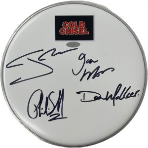 - 27cm Drumskin hand signed by members of Cold Chisel: Jimmy Barnes, Ian Moss, Don Walker & Phil Small