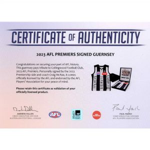 - Features an AFL-licensed and endorsed Collingwood 2023 Signature Series guernsey, personally signed by every 2023 Premiership player, along with Premiership coach Craig McRae