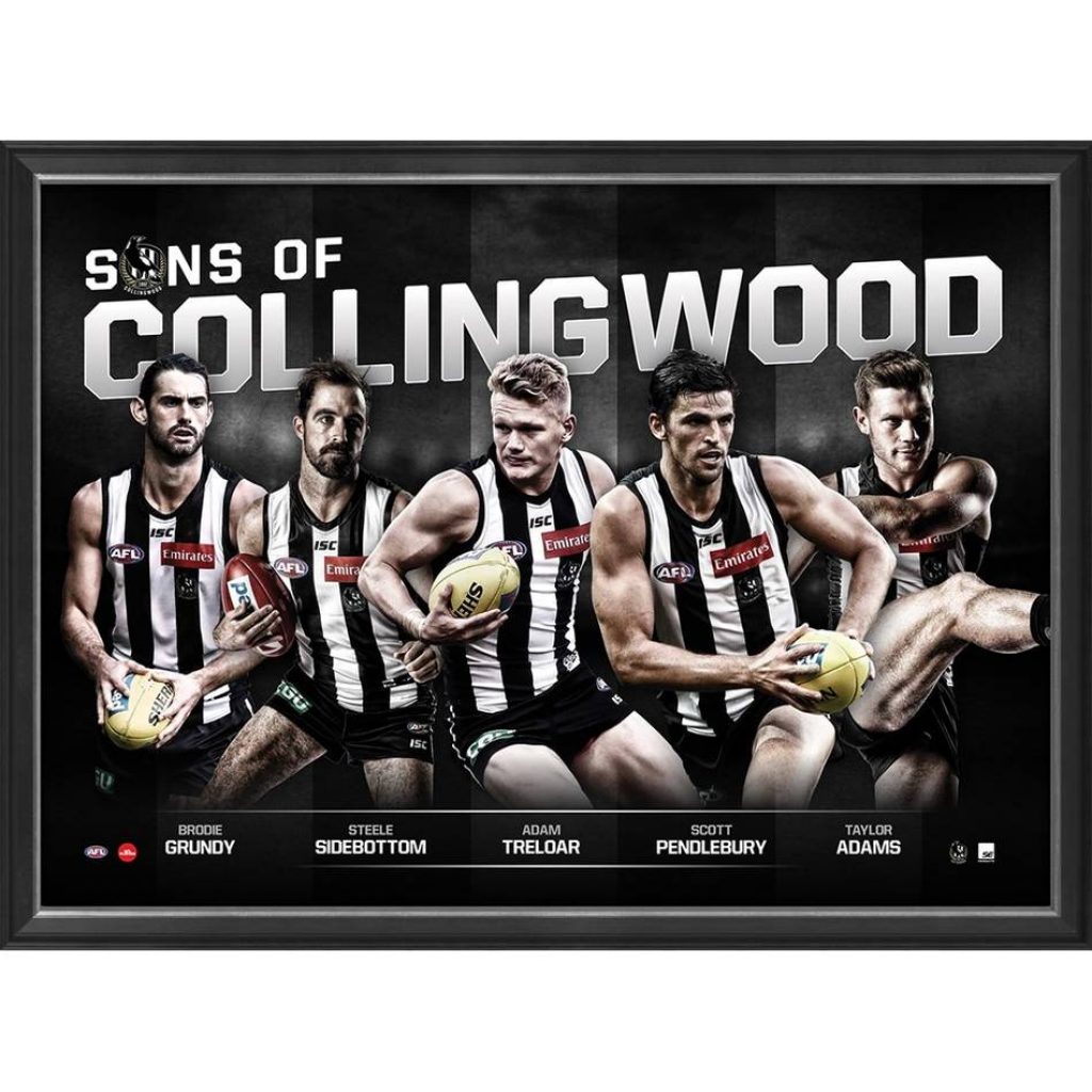 Taylor Made Memorabilia, are proud to release the Sons of Collingwood Multiplayer Sportsprint. Featuring five of Collingwood’s most loved stars – Brodie Grundy, Steele Sidebottom, Adam Treloar, Scott Pendlebury and Taylor Adams – Sons of Collingwood comes officially licensed and endorsed by AFL and AFLPA. This beautifully presented sportsprint serves as the perfect gift for any Pies fan, so don’t miss out – secure yours before stock runs out!