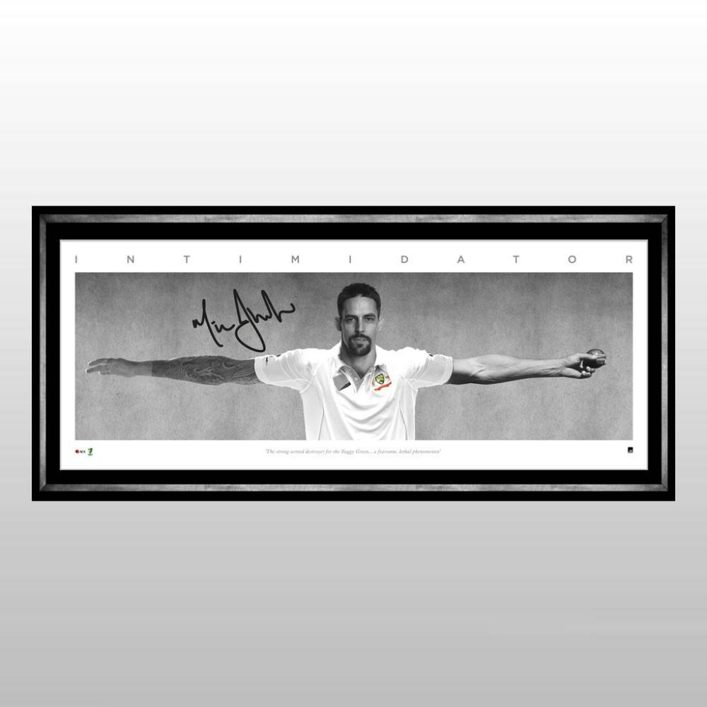 We are pleased to present ‘INTIMIDATOR’. Featuring an iconic still of Australia’s chief destroyer Mitchell Johnson, it comes personally signed and independently authenticated by a-Tag. Limited to 500 editions worldwide, ‘INTIMIDATOR’ is a must-have for any cricket fan who has been glued to the Baggy Green revolution and is expected to sell out in record time, so secure yours today to avoid disappointment.