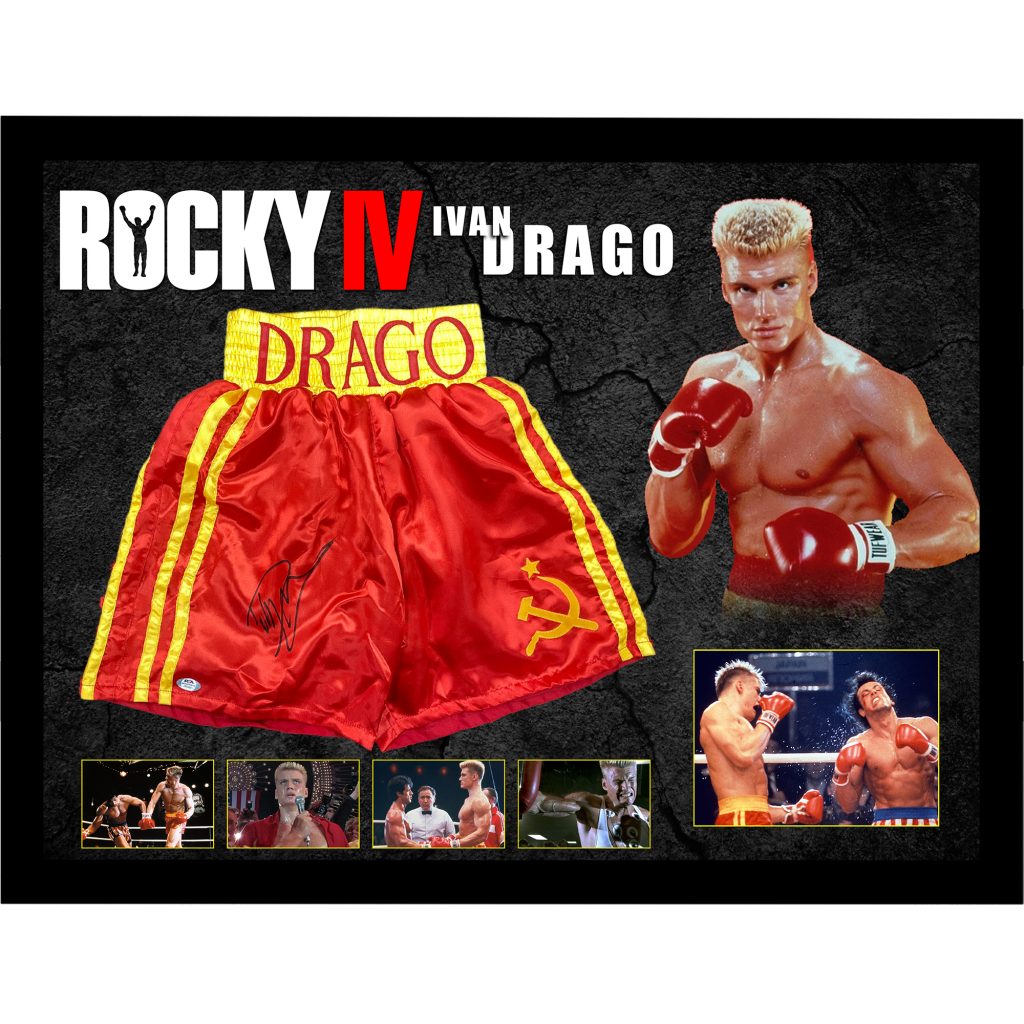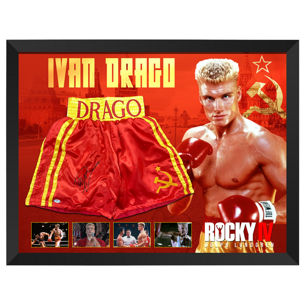 Dolph Lundgren – Signed & Framed Rocky IV Red/Gold Trunks (PSA COA)
