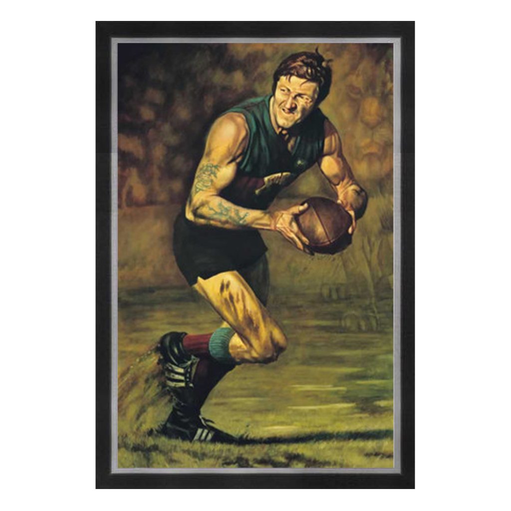 Fitzroy legend Kevin Murray has been captured here at his gritty, determined best. Ploughing through the mud at Brunswick Street, steely eyed and ready to launch the waterlogged ball forward for his beloved lions.”Notice the spirit of the Lion behind him to the right. The golden tones of the print give it that feel of yester year, the classic feel that befits a true legend of the game.The original canvas stands a colossal 3 metres high and is the only original oil painting that artist Jamie Cooper has not been able to part with.