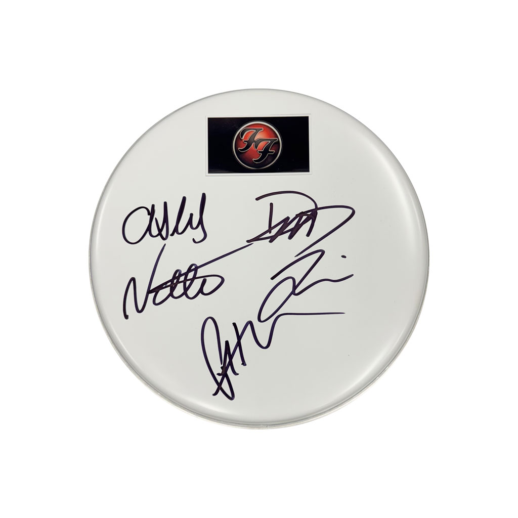 - White drumskin hand signed by members of Foo Fighters: Dave Grohl, Taylor Hawkins, Pat Smear, Nate Mendel & Chris Shiflett