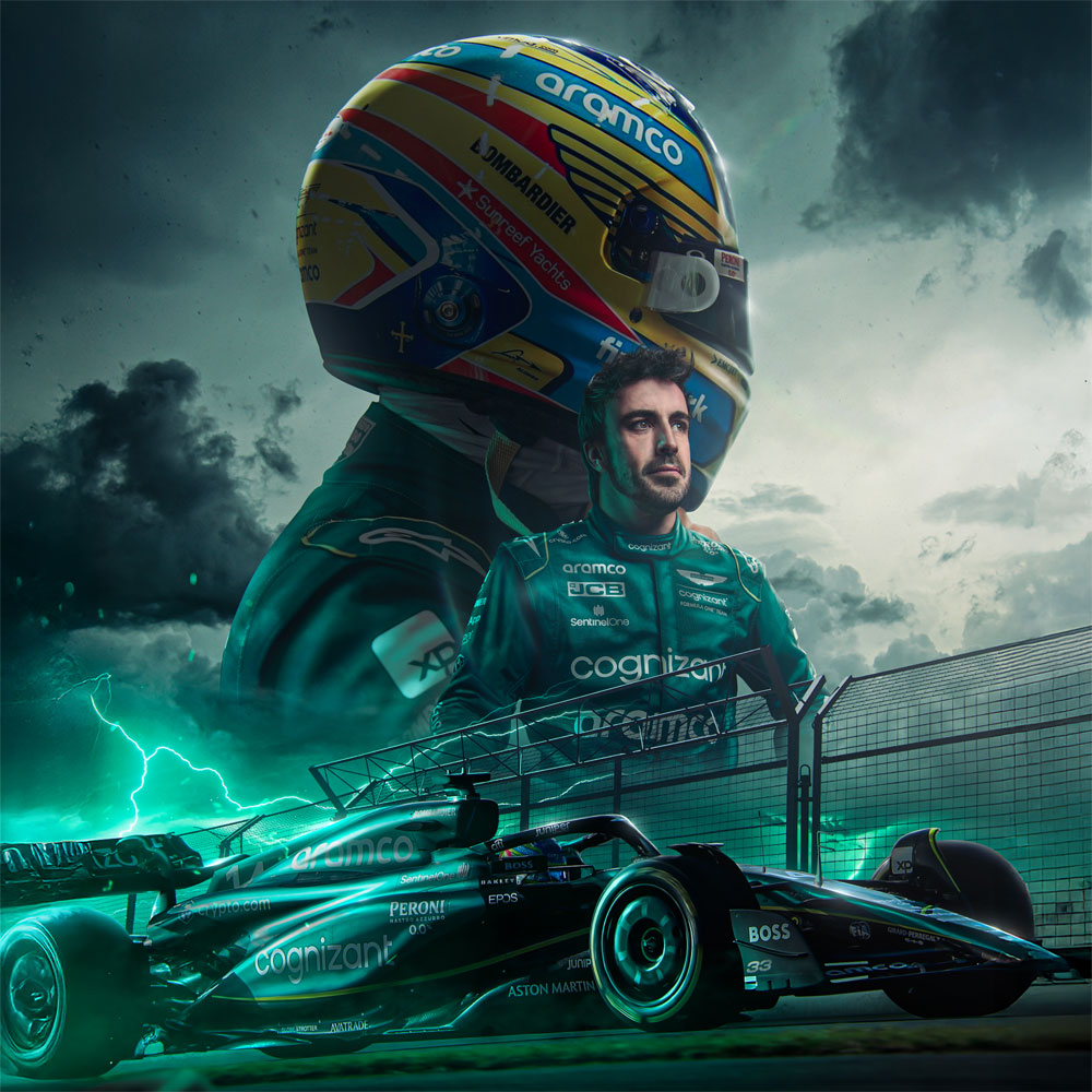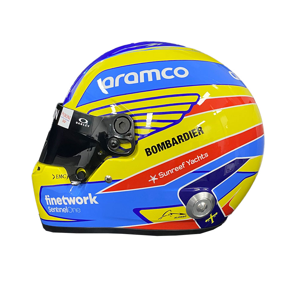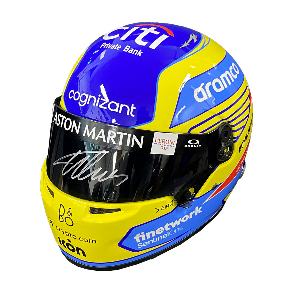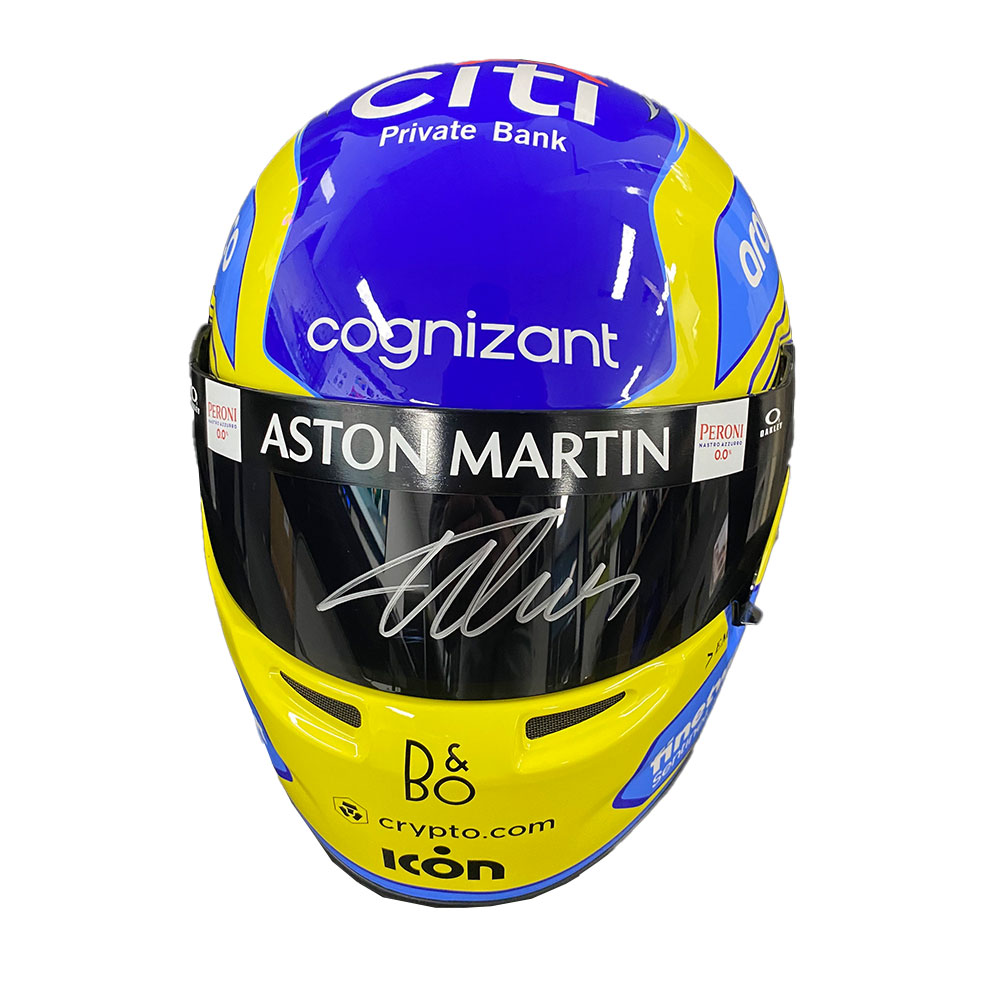 • Full size 1:1 replica 2023 Aston Martin Race helmet hand signed by Fernando Alonso