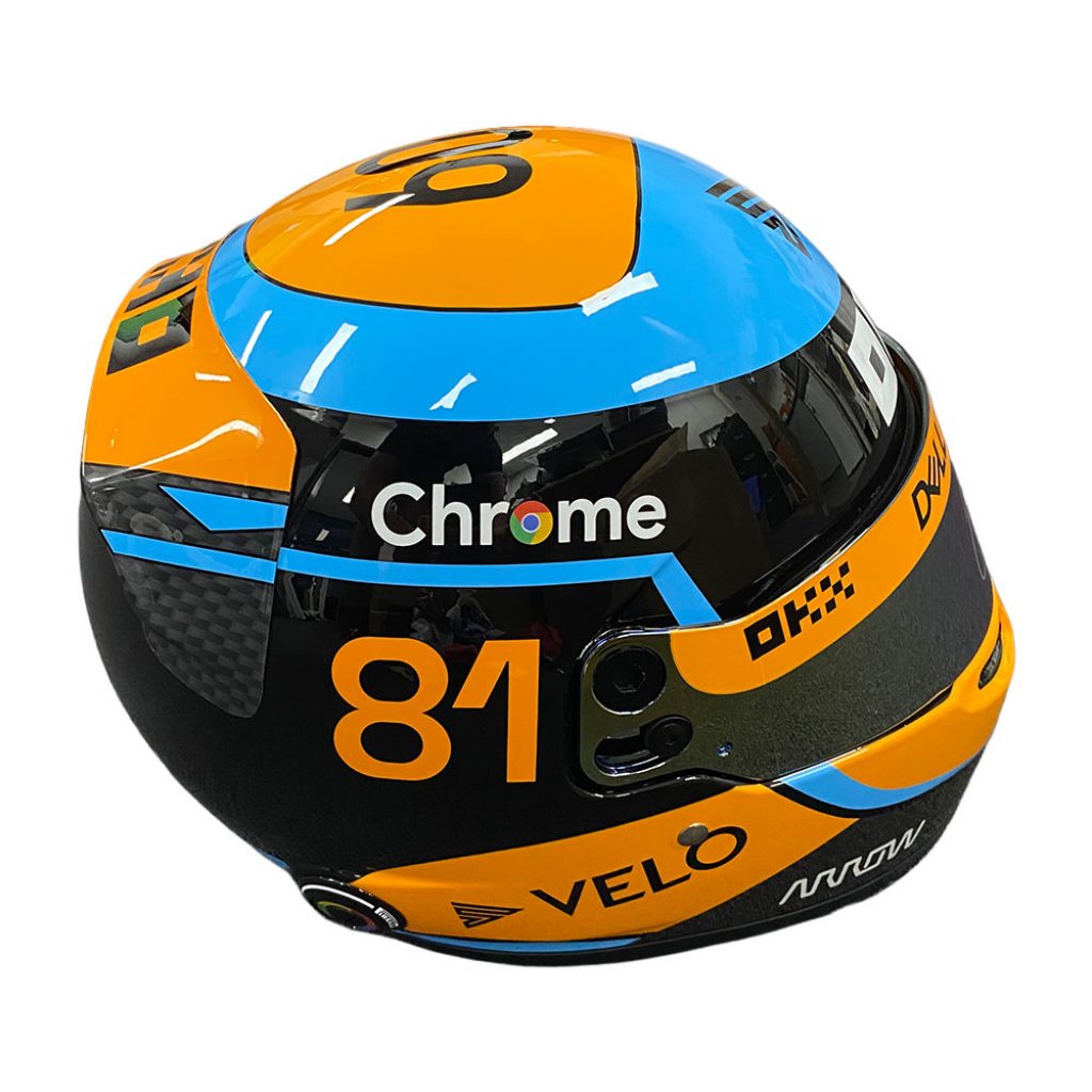 • McLaren Race Helmet featuring Oscar Piastri & Lando Norris numbers 81 & 4 hand signed by Oscar Piastri