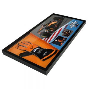 - Presented in a deluxe timber frame with graphic backdrop. Glove is recessed into the frame
