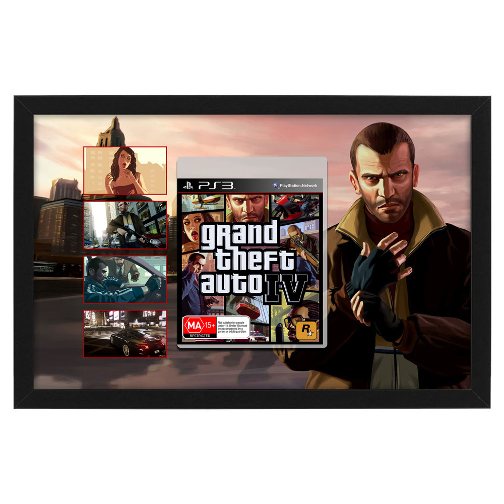 - Features a mock video game case of Grand Theft Auto 4