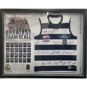 - Features an official Cotton On Geelong 2022 home guernsey, complete with the 2022 AFL Grand Final logo, personally signed by every 2022 Premiership player, along with Premiership coach Chris Scott
