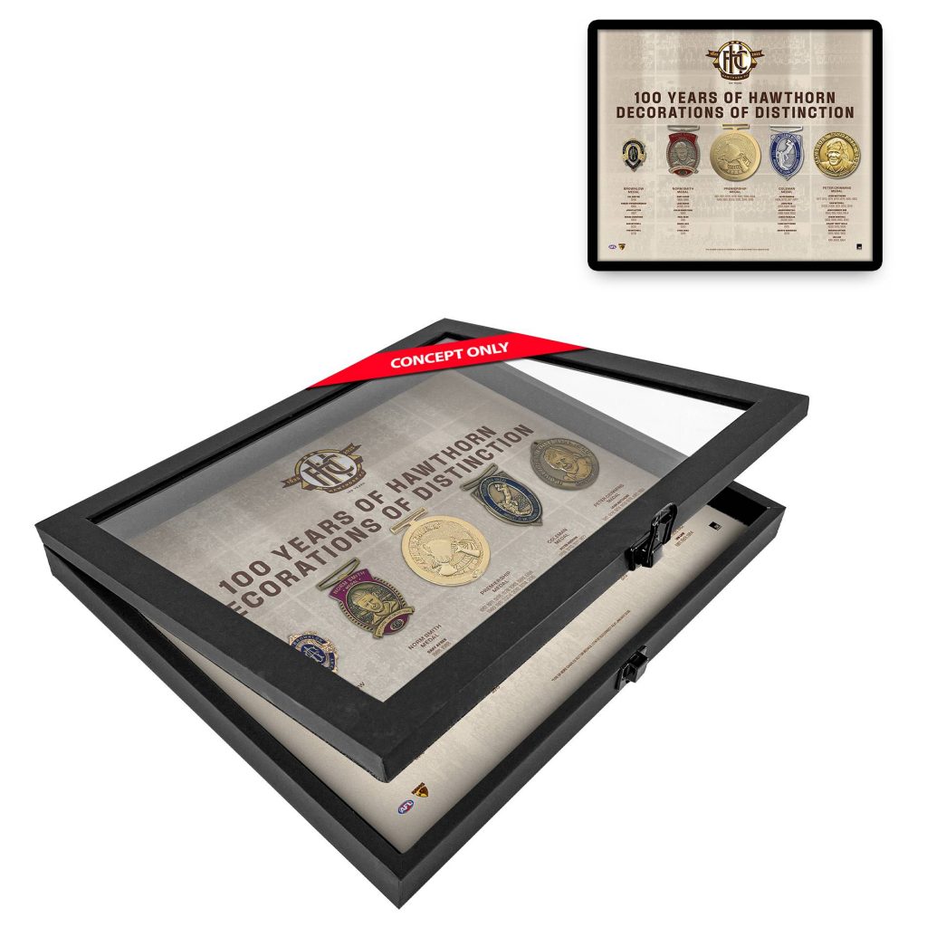 Includes a replica Premiership Medal, Brownlow Medal, Coleman Medal, Norm Smith Medal and the Peter Crimmins Medal, complete with the names of the recipients of each distinction