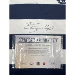 To celebrate the 2022 Geelong Cats Premiership, Official Memorabilia, in conjunction with the Geelong Cats and the AFL, are proud to offer this Joel Selwood signed guernsey. A must-have for every Geelong Cats fan, these famous blue and white hooped guernseys are replicas of the ones you see on your favourite player on game day. Paying homage to the 2022 Premiers, the guernsey features an official 2022 Grand Final Patch, a unique opportunity for Cats fans and astute memorabilia collectors everywhere.