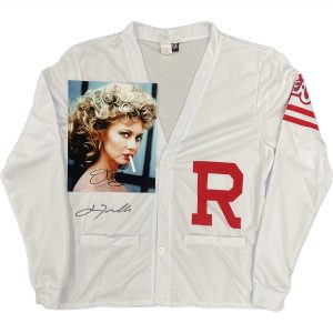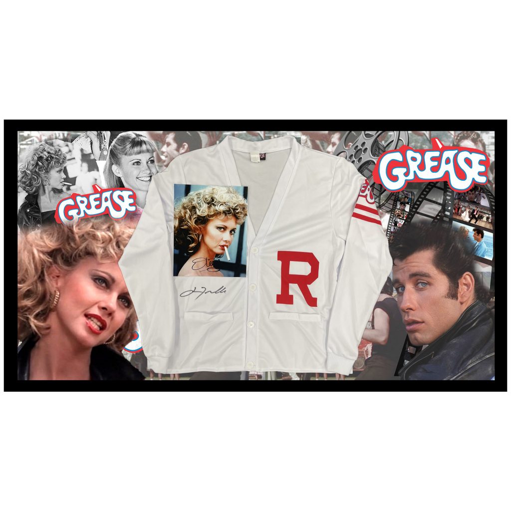 John Travolta & Olivia Newton John – Signed & Framed Rydell High Sweater 8×10 Photograph