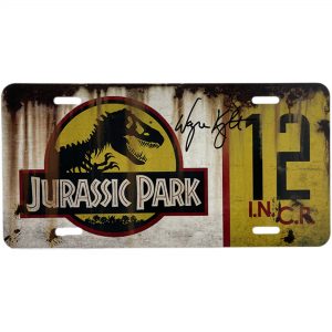 - Replica “rusted” look Jurassic Park Jeep #12 License Plate hand signed by Wayne Knight