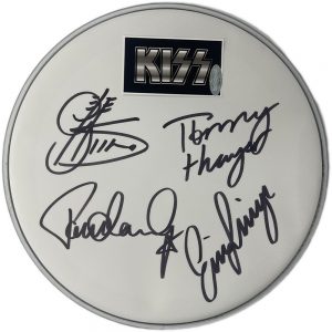 - White Drum Skin/Drum Head hand signed by members of KISS: Gene Simmons, Paul Stanley, Tommy Thayer & Eric Singer