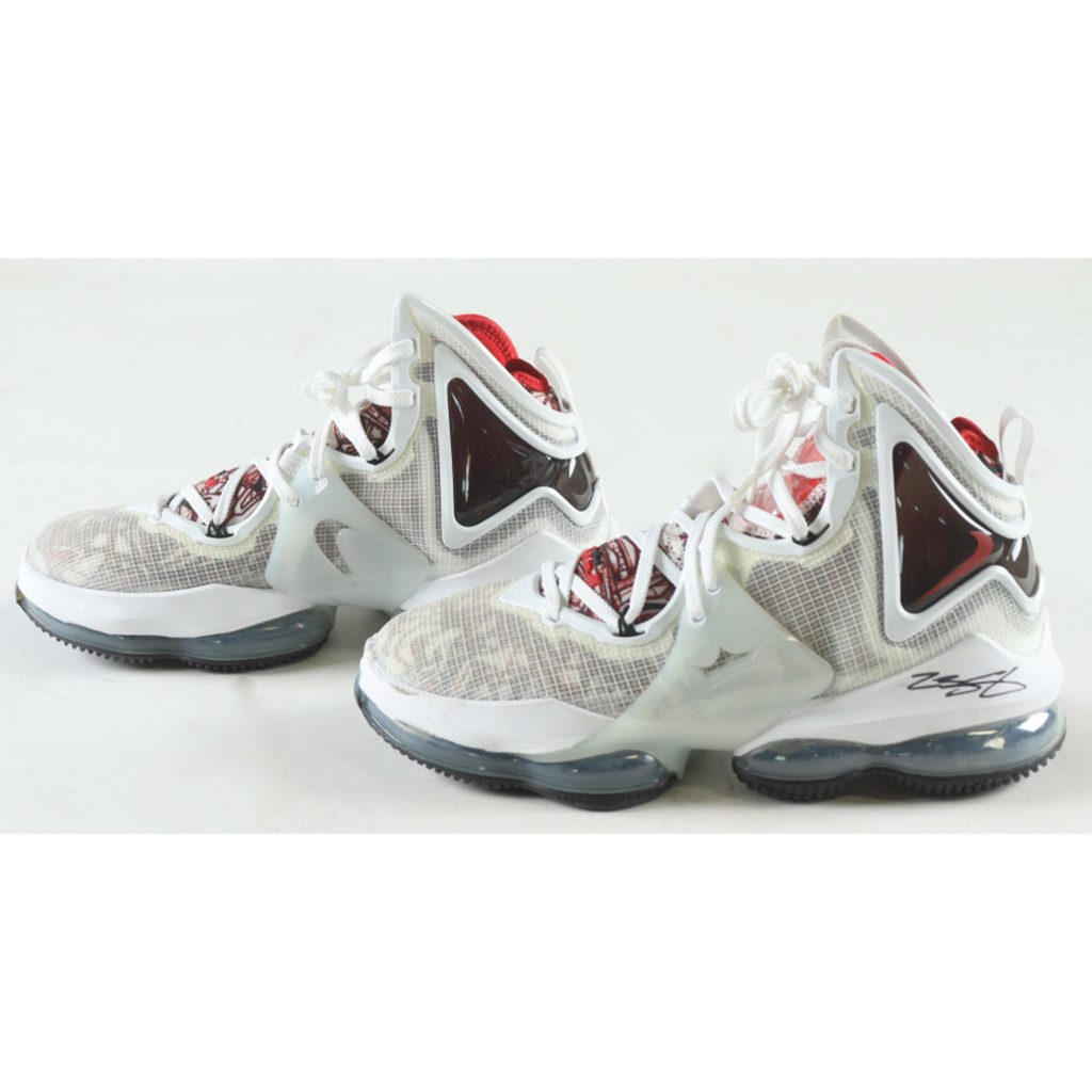 • Pair of Nike LeBron 19 XIX Sketch White/Red size 7.5 basketball shoes hand-signed on the left shoe by LeBron James (Los Angeles Lakers)