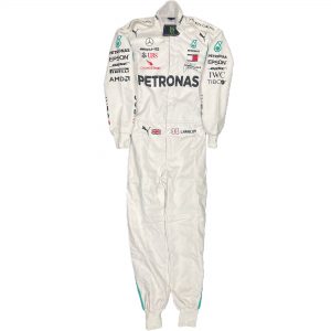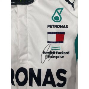 - Features a full size white F1 Race Suit hand signed by Lewis Hamilton