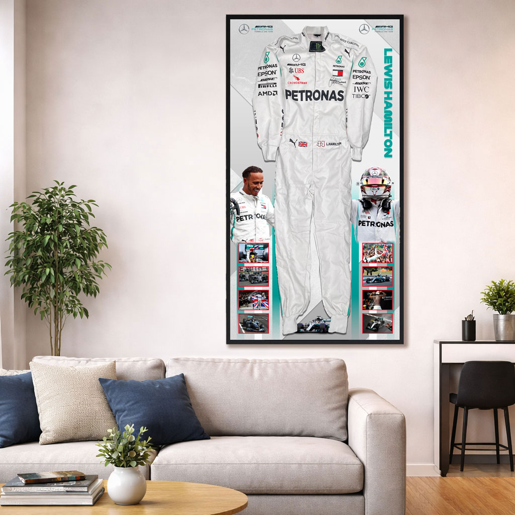 - Features a full size white F1 Race Suit hand signed by Lewis Hamilton