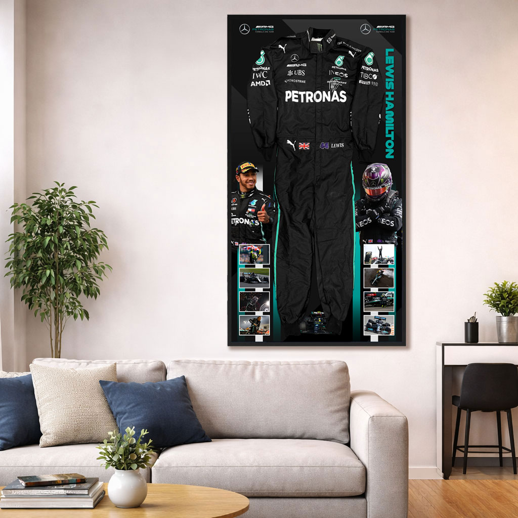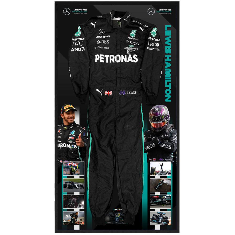 • Features a full size black F1 Race Suit hand signed by Lewis Hamilton (Mercedes)