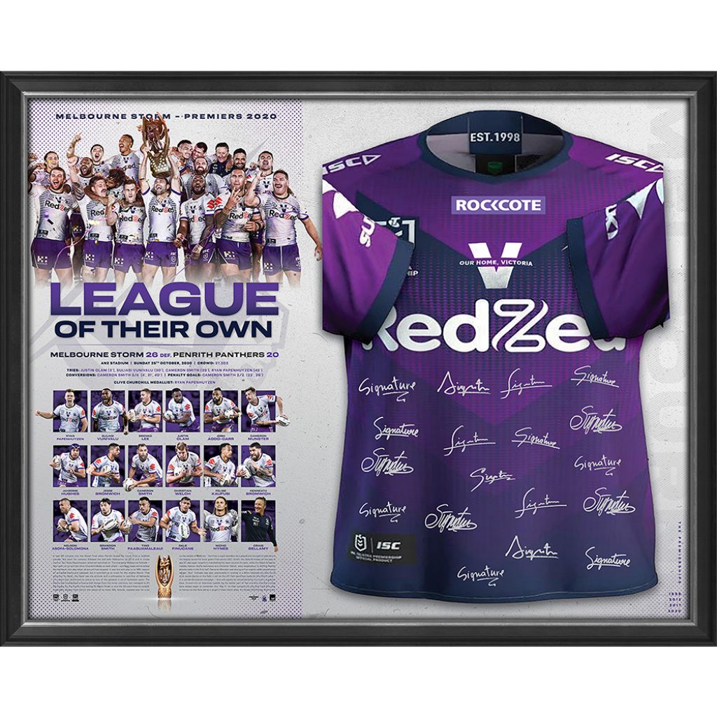• Features an officially licensed Melbourne Storm jersey, personally signed by all 17 Storm players from the 2020 NRL Telstra Premiership Grand Final, along with coach Craig Bellamy