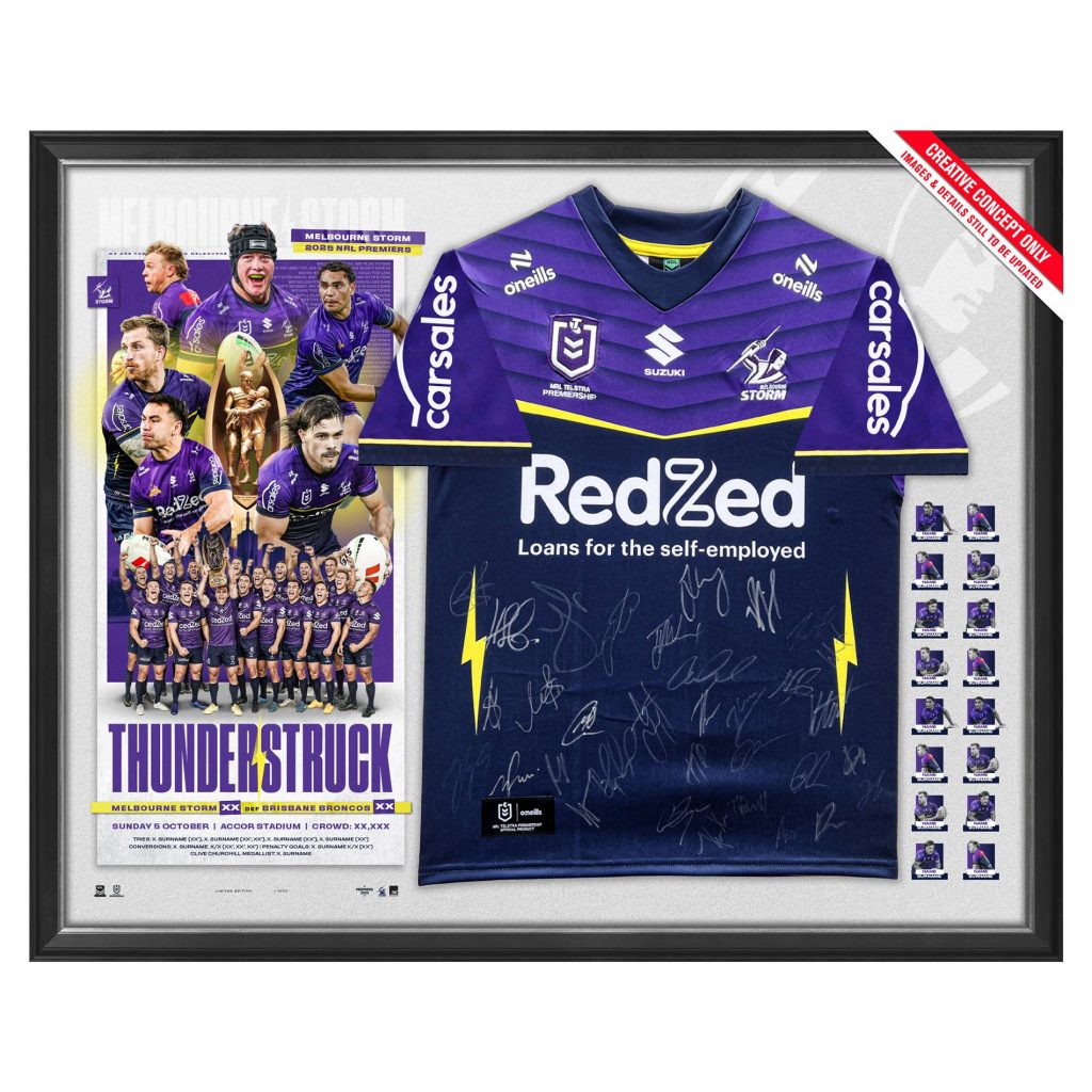 • Features an official Melbourne Storm 2025 jersey, personally signed by the 2025 Premiership team