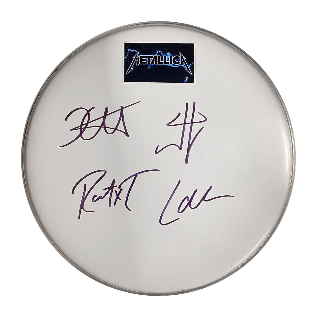 • 32cm Drumskin hand signed by members of Metallica: James Hetfield, Lars Ulrich, Robert Trujillo & Kirk Hammett