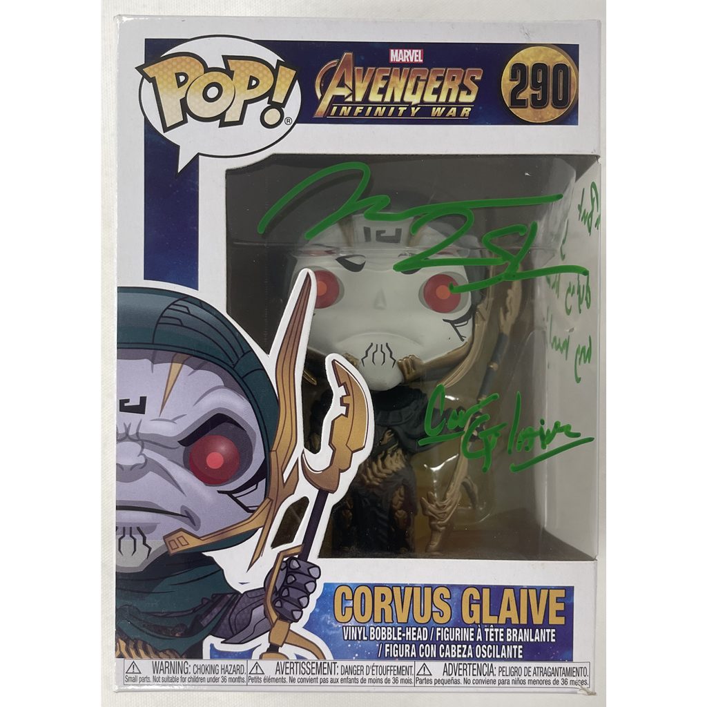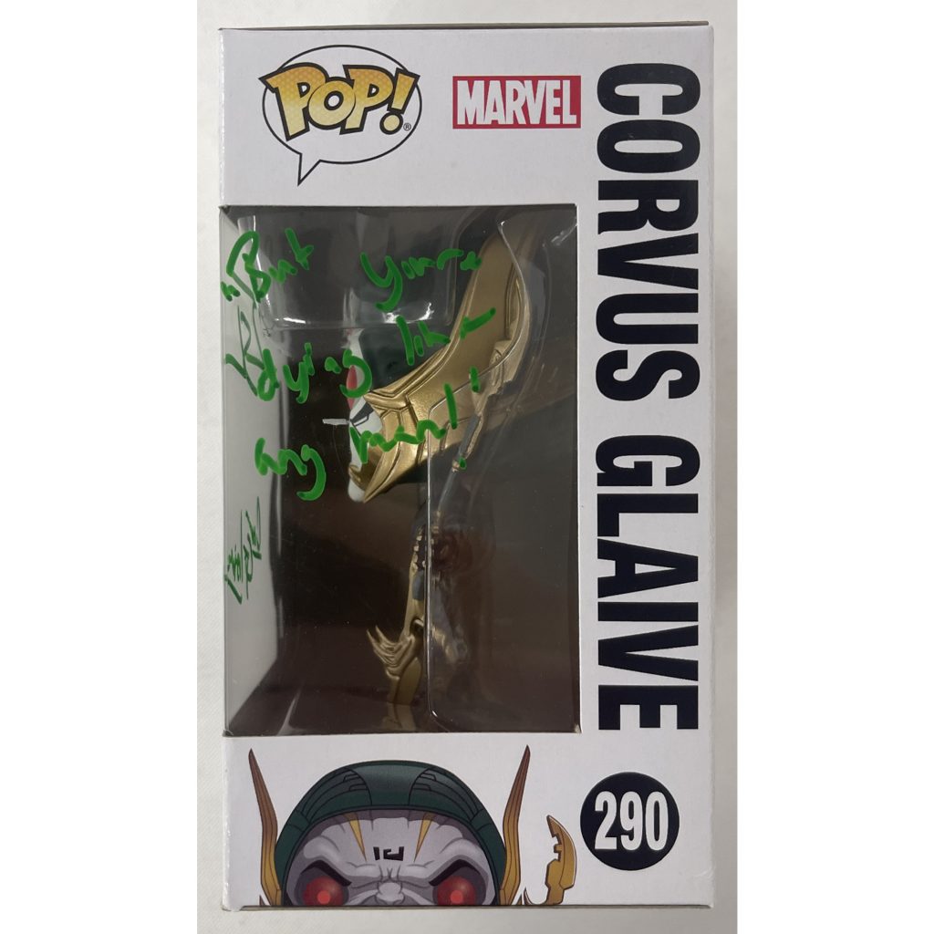 - Corvus Glaive #290 Funko Pop! Vinyl hand signed & inscribed “Cor Glaive” + “But youre dying like any man!” by Michael James Shaw