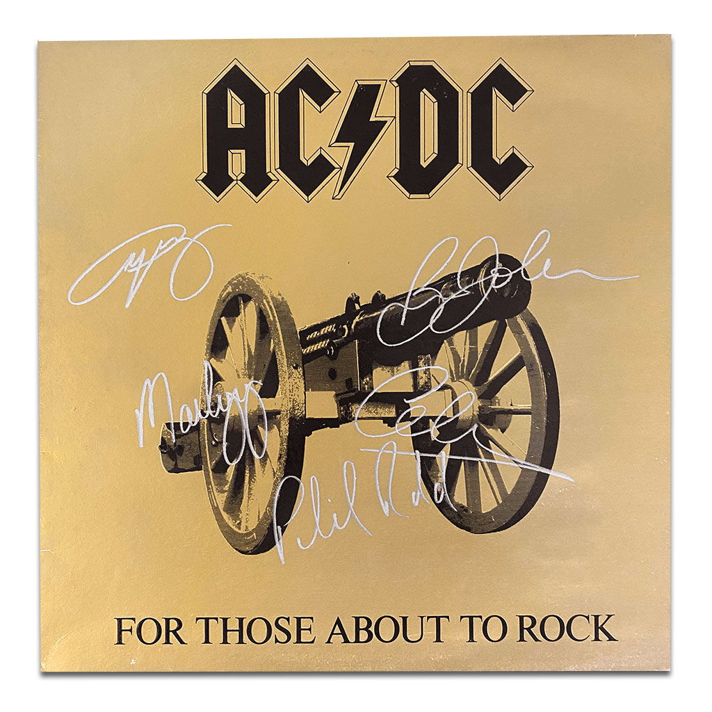 - Full size For Those About To Rock vinyl album cover hand signed by Angus Young, Malcolm Young, Brian Johnson, Phil Rudd, Cliff Williams