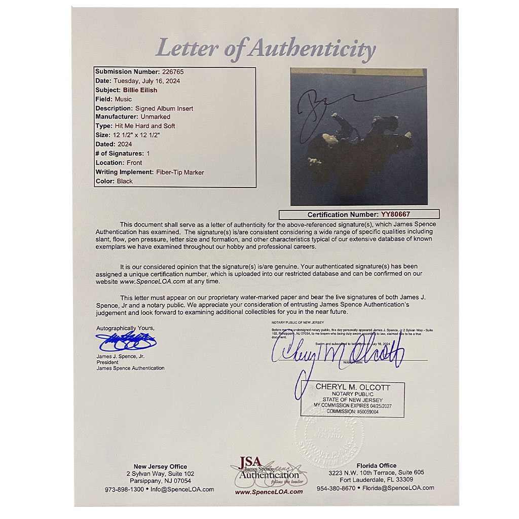 - Full size HIT ME HARD AND SOFT Vinyl Album framed with 12″ x 12″ print hand signed by Billie Eilish