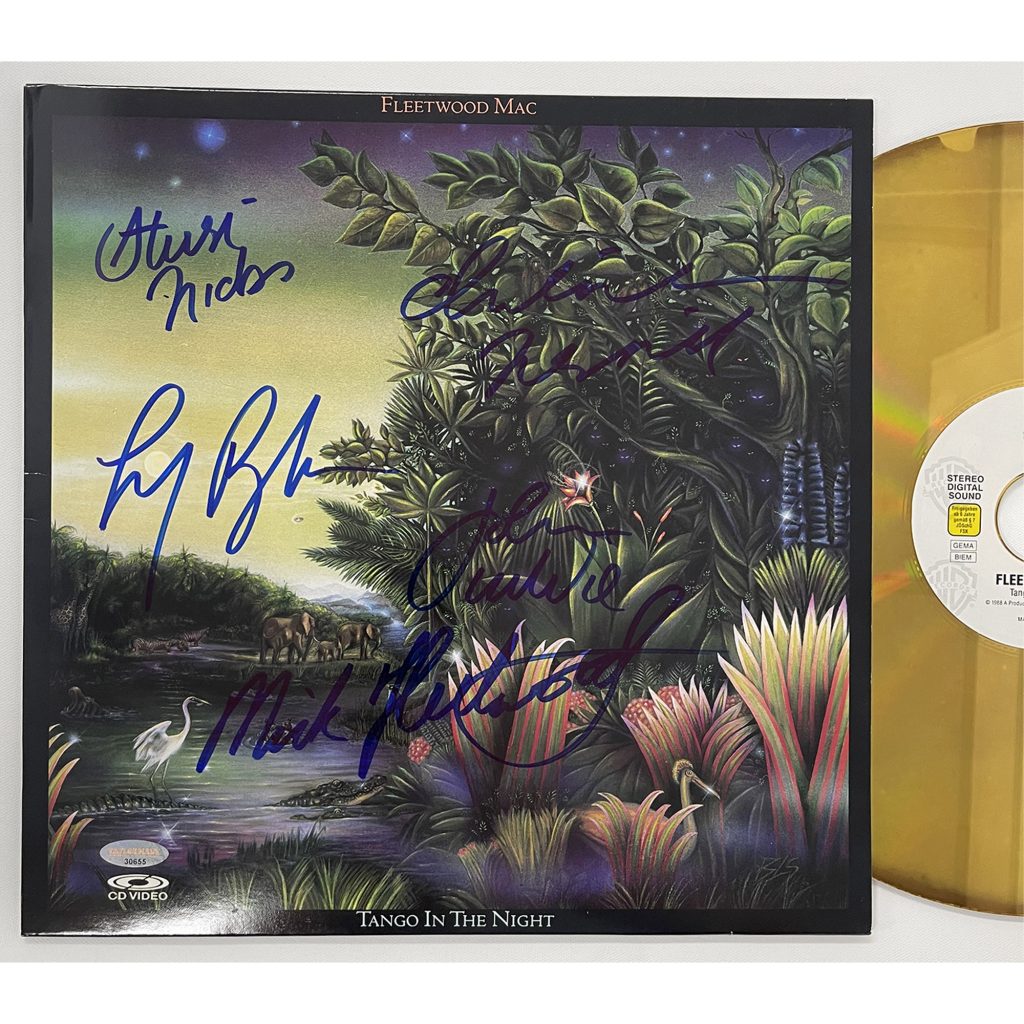 • Full size Tango In The Night Laserdisc vinyl album cover hand signed by Stevie Nicks, Lindsay Buckingham, Mick Fleetwood, Christine McVie & John McVie