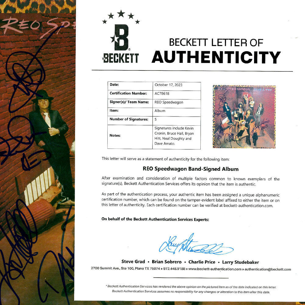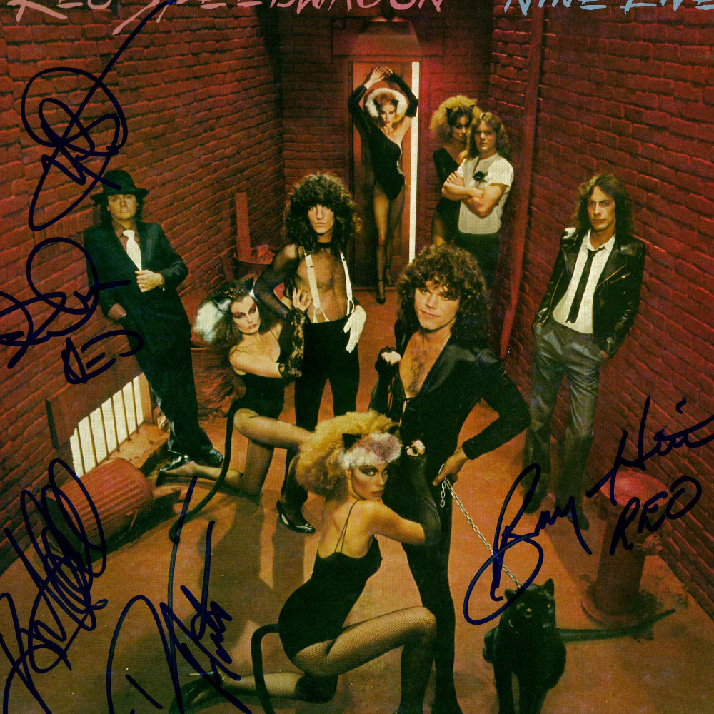 • Full size Nine Lives vinyl album cover hand signed by REO Speedwagon [Kevin Cronin, Gary Richrath, Neal Doughty, Bruce Hall, and Alan Gratzer]