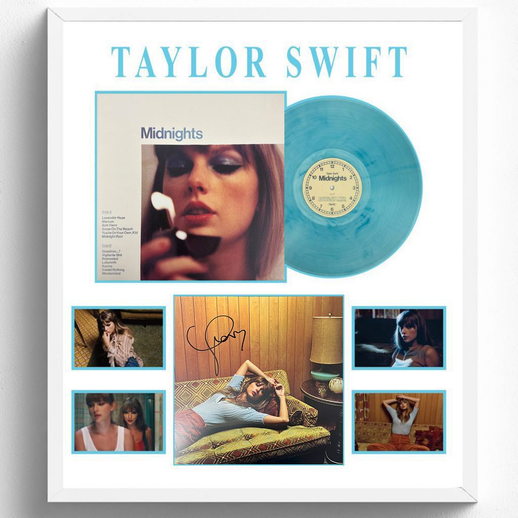- Full size Moonstone Blue Edition Midnights Vinyl Album framed with 28cm x 28cm Midnights print hand signed by Taylor Swift