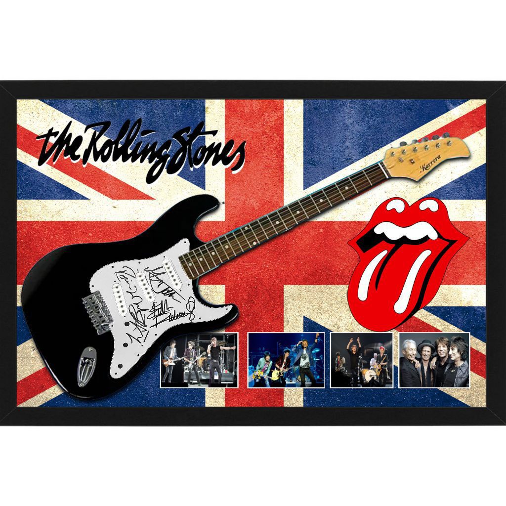 Music – The Rolling Stones Hand Signed & Framed Full Size Guitar with Custom Backdrop