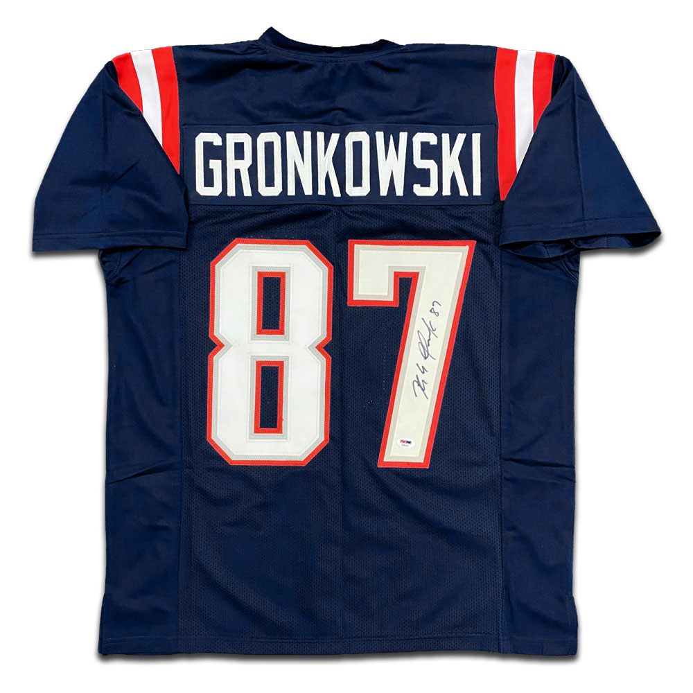 - Blue custom jersey hand signed by Patriots Superstar, Rob Gronkowski