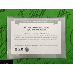 Personally signed by the Canberra playing squad* for the 2024 NRL Telstra Premiership, each jersey comes officially licensed and endorsed by the NRL. It is a must-have for all Raiders fans and collectors alike – don’t miss out, secure yours before this limited stock runs out!